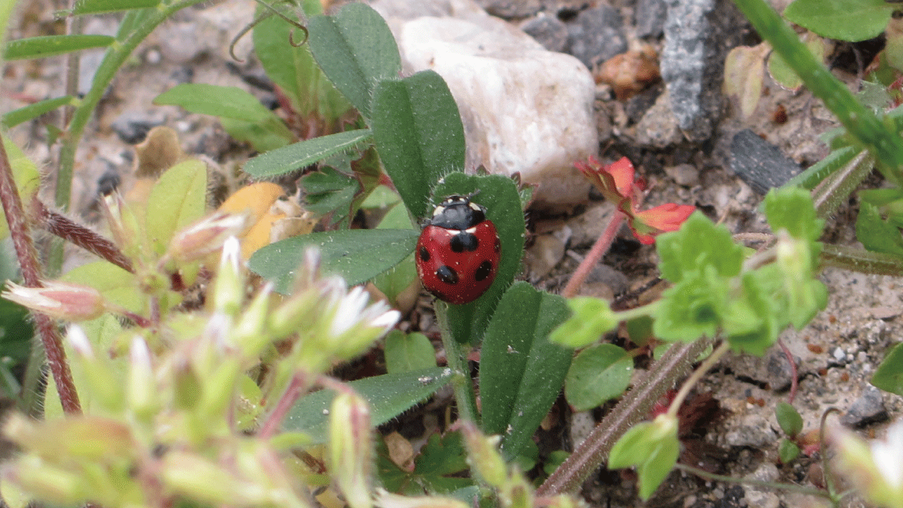 なんせ、幸せのシンボルと言われているてんとう虫の家をぶち壊し、睡眠を邪魔したうえ、一家離散させたのです。幸運がくるどころかバチが当たると怯えた私は、雑草の根元ごともぎ取られた土をならし、その上に草のじゅうたんを敷き詰め、てんとう虫の帰りを待っていました。そこに、逃げそびれ近くにいたてんとう虫が舞い戻ってきたんです。